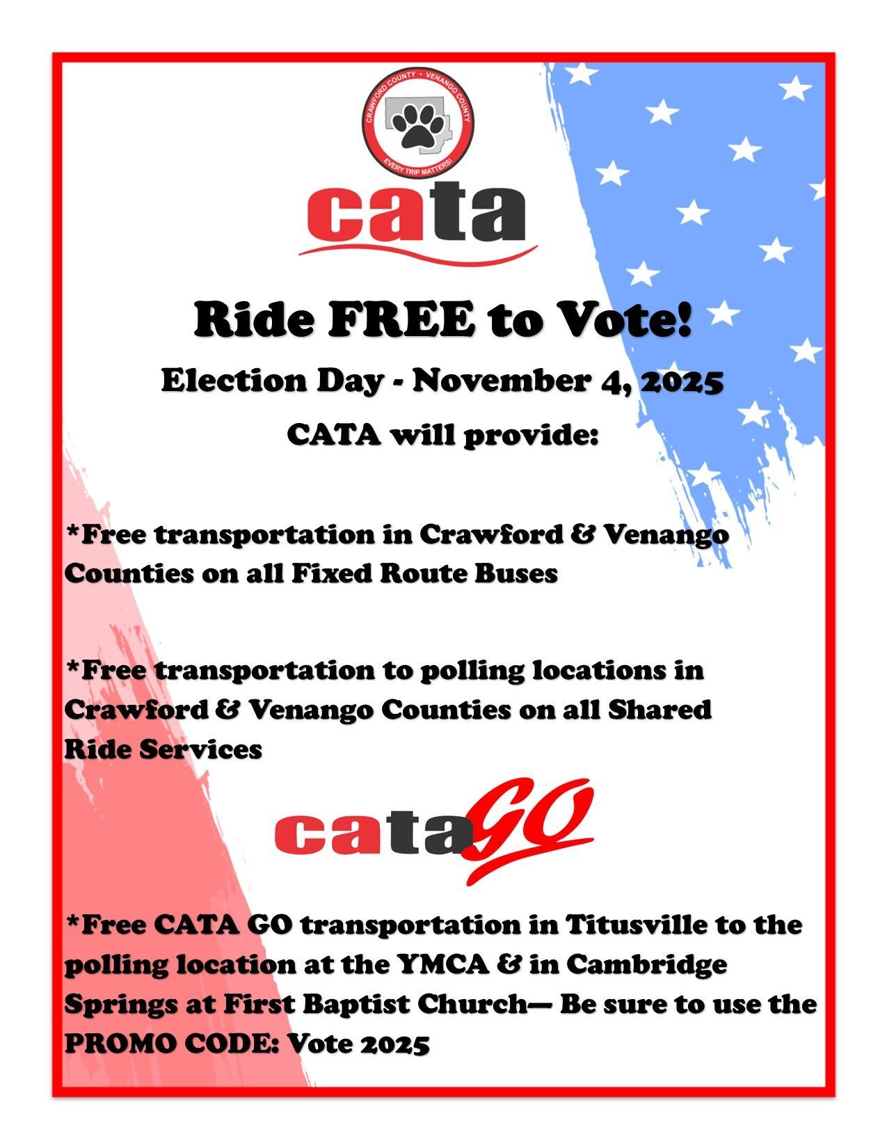 The Crawford Area Transportation Authority (CATA) is proud to announce that the fixed route bus system in Meadville will be returning to full service hours, effective October 10, 2022. In preparation for this change, CATA will post flyers on all Meadville fixed route buses and in bus shelters. Detailed route information will be posted on catabus.org and on the MyStop App. Subscribers of CATA's website will also receive email notification of the changes. New schedules will be available on September 23rd.